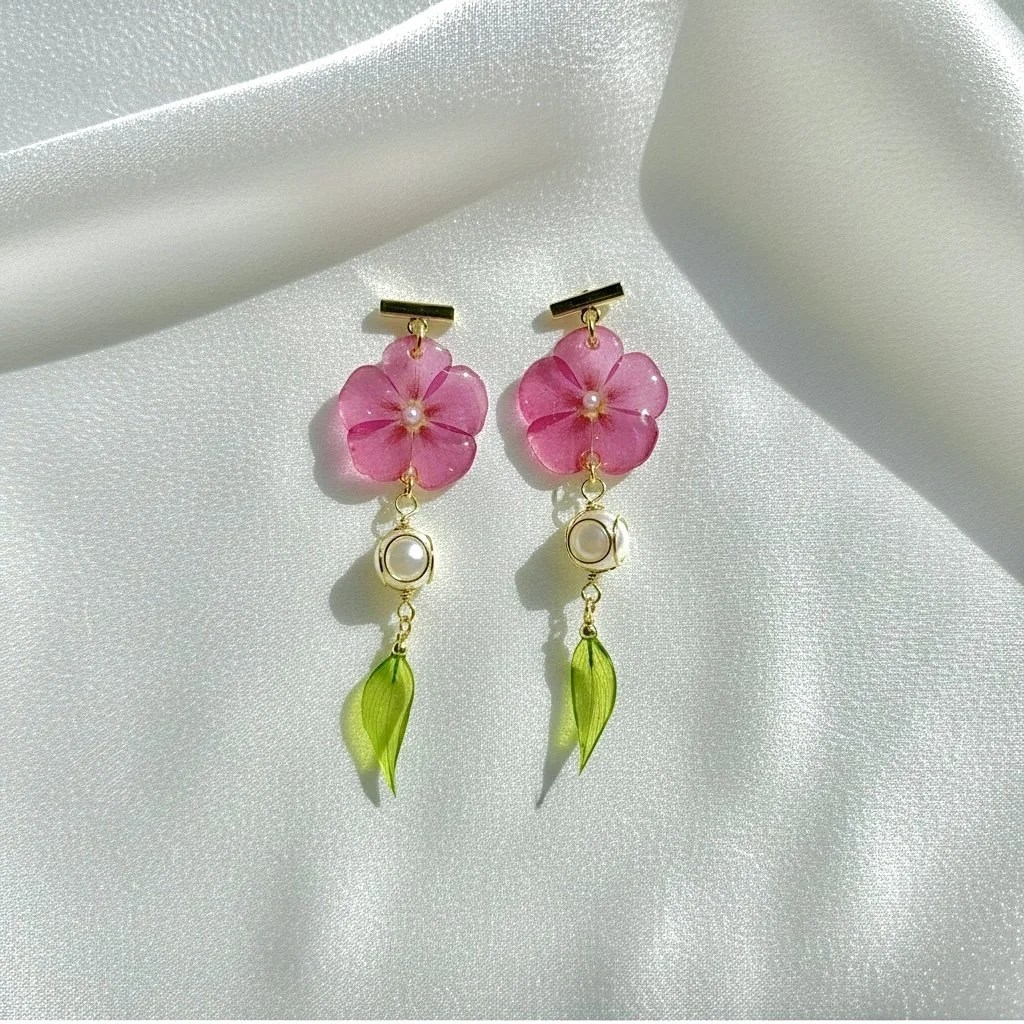 Pressed phlox flowers connected to gold wire wrapped bead and preserved bamboo leaf cured in resin